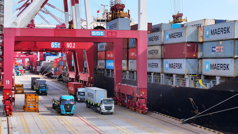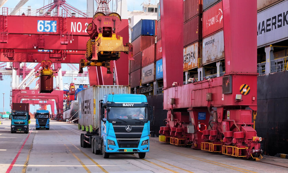 ↑青岛港前湾港区,货运卡车在运送集装箱(无人机照片,10月29日摄)。