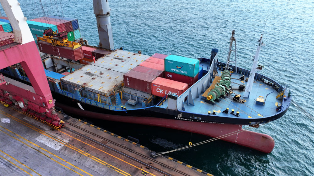 ↑直达韩国仁川港的“泛奥升奥普轮”在青岛港前湾港区装卸集装箱(无人机照片,10月29日摄)。