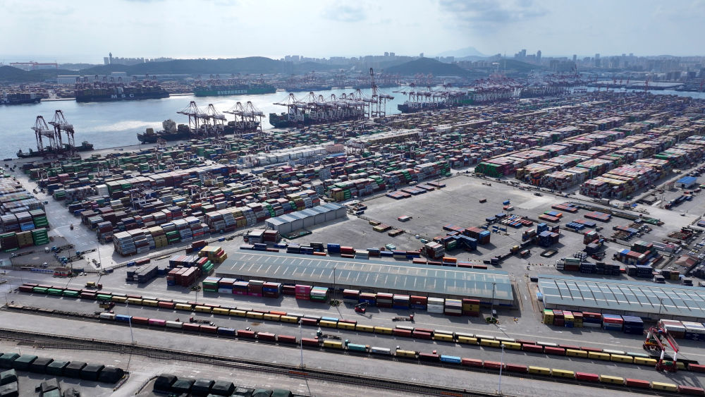 ↑这是繁忙的青岛港前湾港区(无人机照片,10月29日摄)。