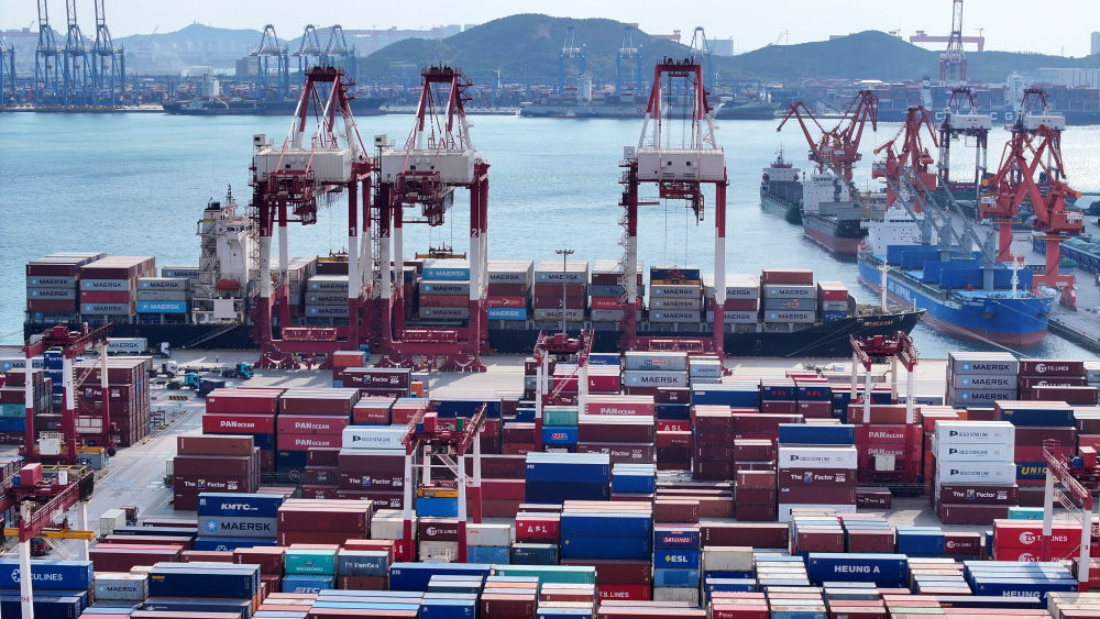 ↑青岛港前湾港区,货轮在装卸集装箱(无人机照片,10月29日摄)。