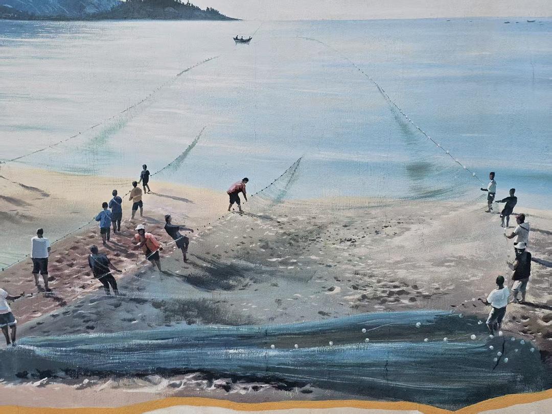 渔民先用渔船将巨大的渔网撒入海中,布下一个半圆或椭圆形的包围圈。随后渔网的两端被拖回岸上,岸上游客少则数十、多则上百,分成几排,齐心协力喊着号子,一步步将沉重的渔网拖上岸。往往一网能拖上千斤鱼。