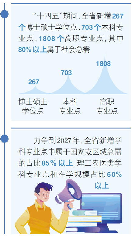 目前,全省高校共设置1300余个博士硕士学位点、3800余个本科专业点、5100余个高职专业点,理工农医类在校生占比达到61.6%,形成基本动态适配现代化产业体系、全面支撑经济社会高质量发展的学科专业总体布局。