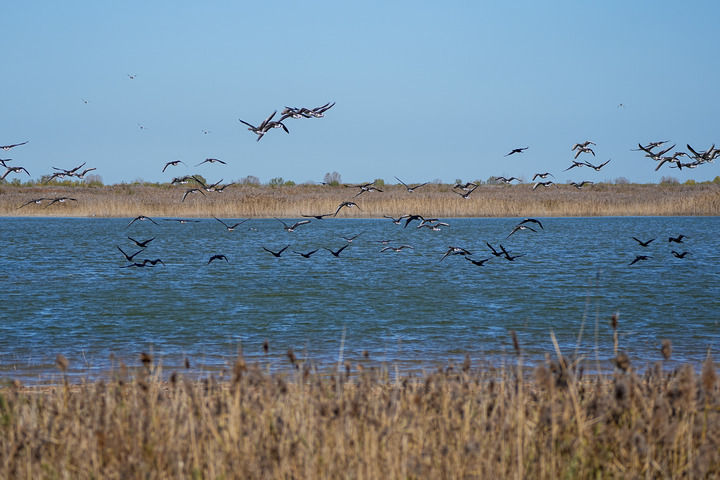 2025年11月13日,山东黄河三角洲国家级自然保护区内,候鸟在飞翔。新华社记者 朱峥 摄
