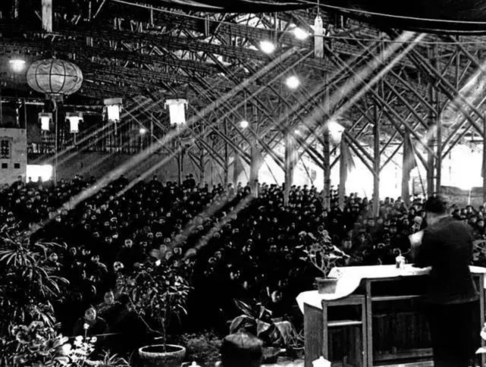 用竹篾草棚搭建的临时大礼堂(图片来源:西安交通大学新闻网) 1959年,学生们在西迁后的交大校园图书馆阅览室内学习(资料照片)。新华社发