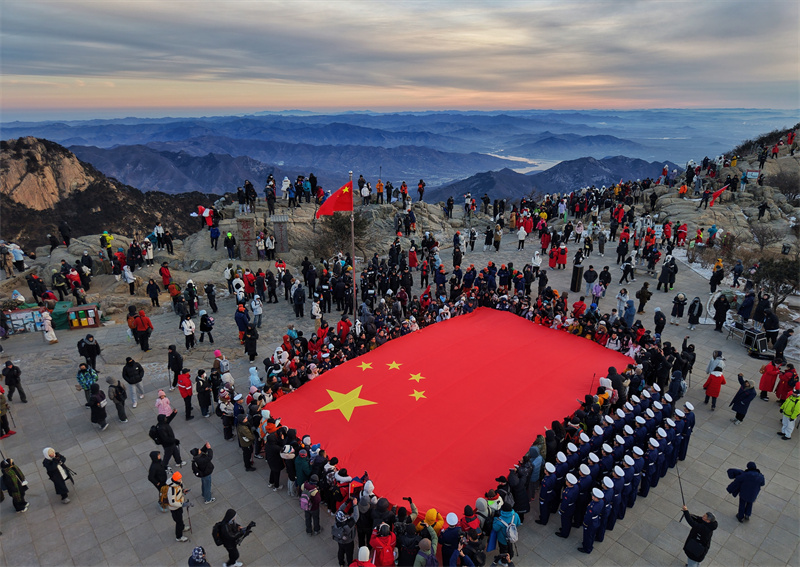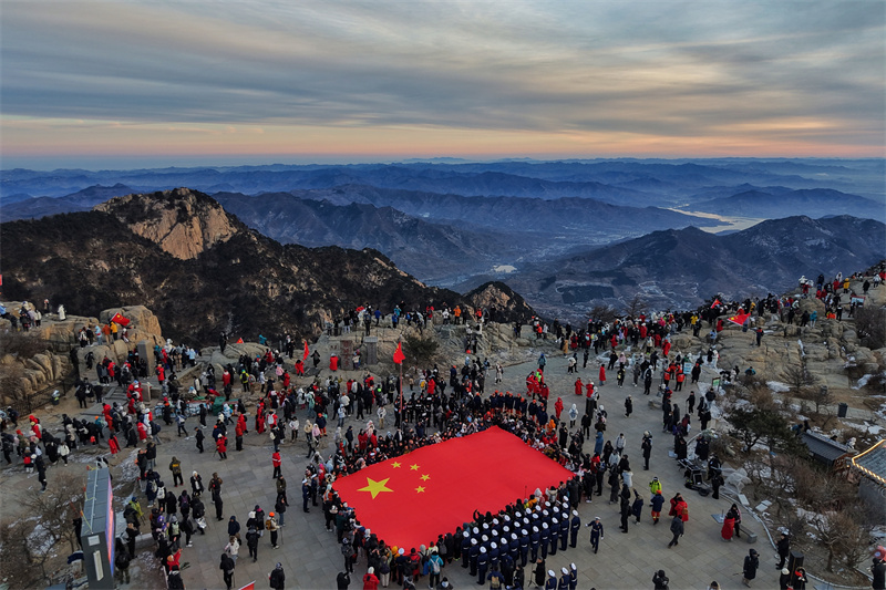 在新年的晨光中,一场庄严的升国旗仪式在太平顶举行。《义勇军进行曲》响起,护旗手迈着铿锵有力的步伐走向升旗台。鲜艳的五星红旗在万众瞩目中缓缓升起,迎风飘扬在泰山之巅。伴随着一声声“祖国,我爱你”,巨幅国旗徐徐展开,与初升的朝阳、壮丽的山河交相辉映,将现场气氛推向高潮。